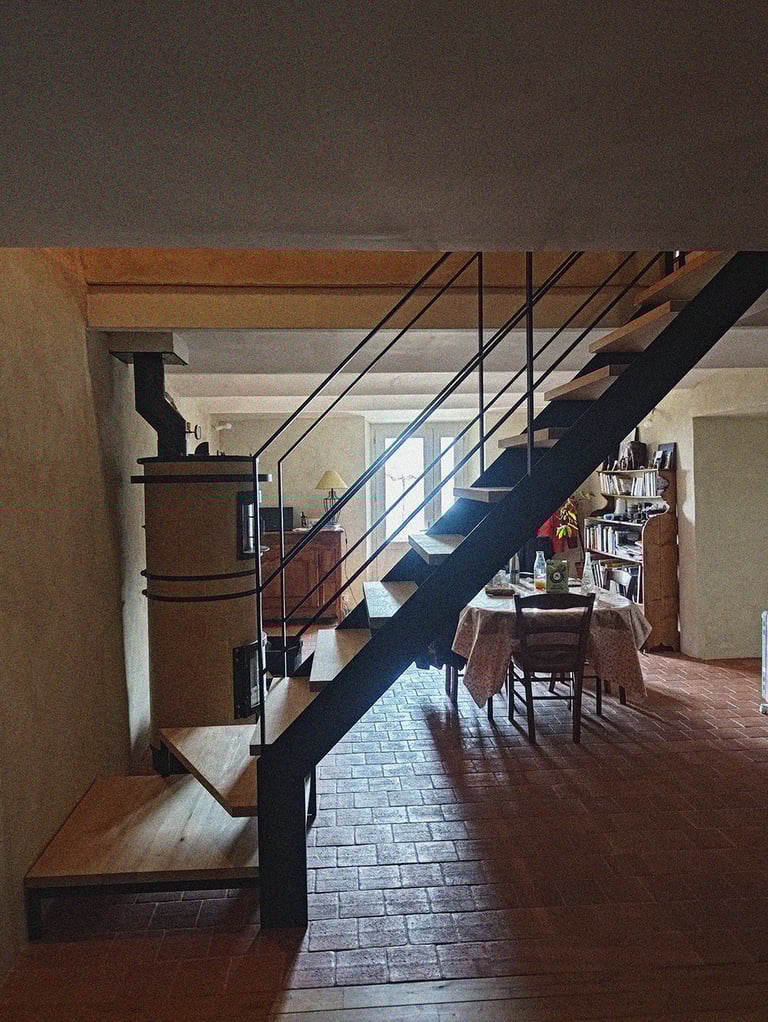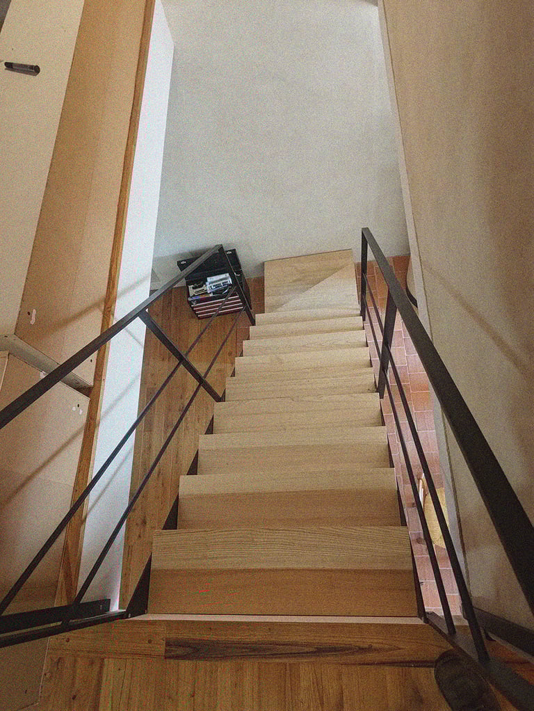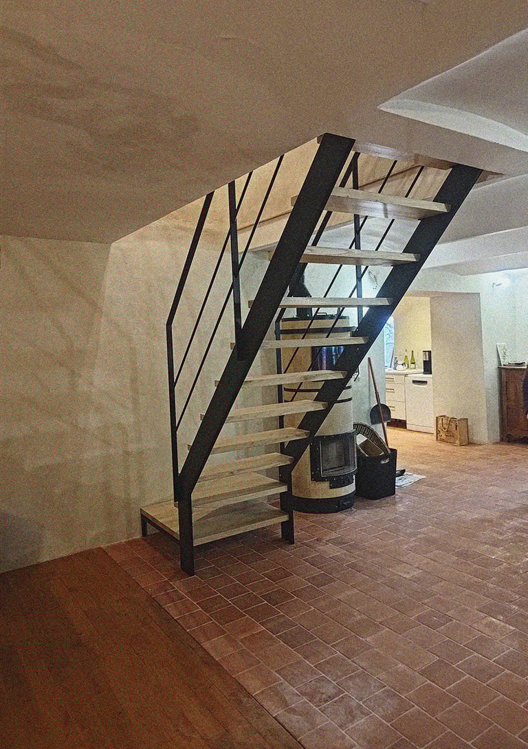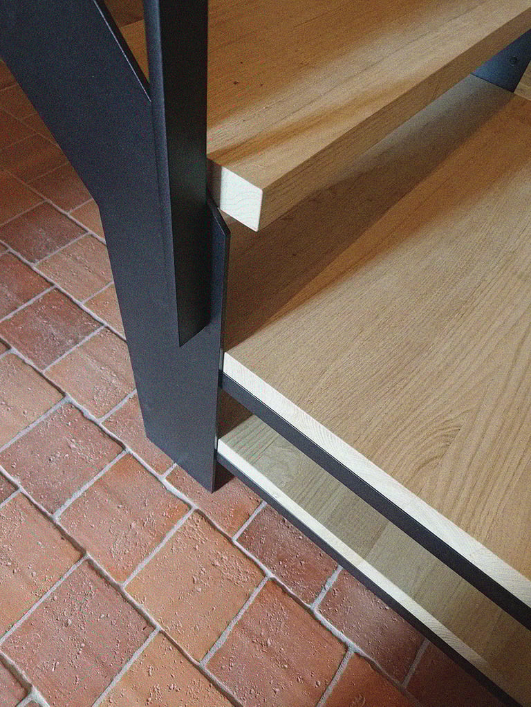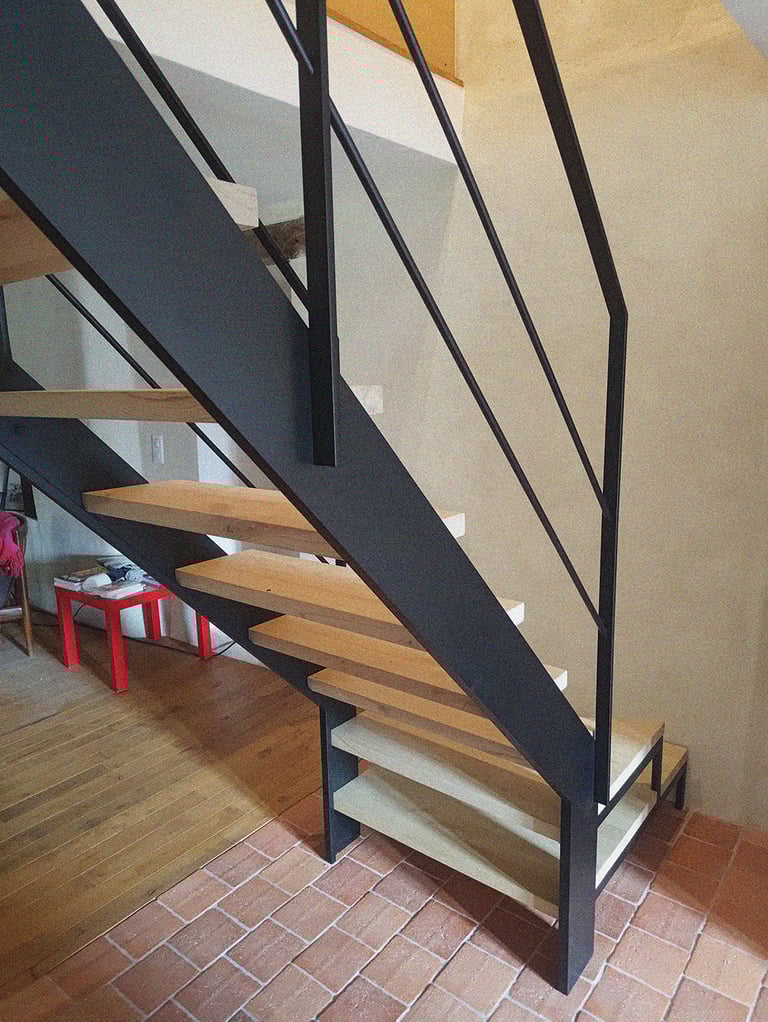 Escalier limons et garde-corps acier thermolaqué, marches en châtaigner brut